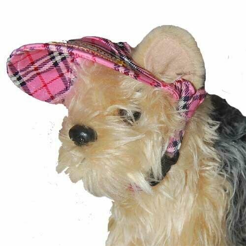 Lyserød hundekasket i kilt-look, beskytter øjnene mod solen gennem skyggen.