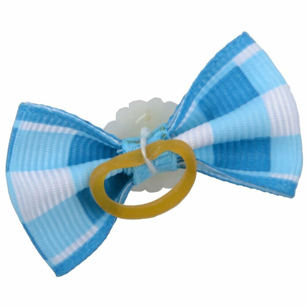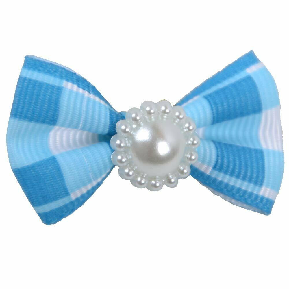Lyseblå ternet hundesløjfe med sten. Den cirka 4 cm x 2,2 cm store hårsløjfe fra Dufant er lavet i det fineste håndværk