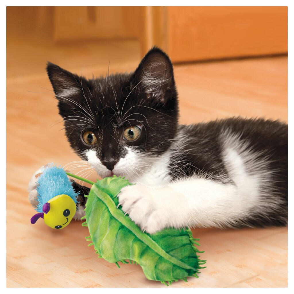 Den elastiske strop og det knitrende blad vækker kattens nysgerrighed og legeglæde, mens den lette larve er perfekt til at slå til, trække i og slæbe rundt på. Med tilsat katteurt bliver legen ekstra spændende og sikrer timevis af underholdning.