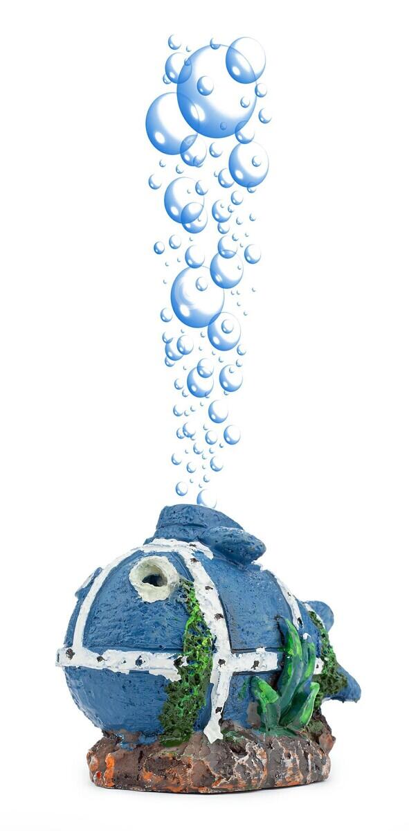 Bubble Deco Aquarium Decoration - Submarine En smuk dekoration, skabt med akvarieelskere i tankerne! Det kan diversificere ethvert arrangement ved at skabe en naturlig atmosfære i tanken. Dekorationen er lavet af polyester, der synker let og er sikker for fisk og andre vanddyr. Sættet inkluderer en silikoneslange og en beluftningssten, der sprøjter en luftstrøm af små bobler, der forsyner vandet med ilt og skaber en meget interessant wall of bubbles-effekt.
