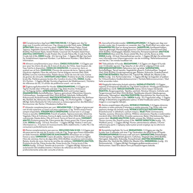1-3 Ziggies om dagen til hunde over 3 måneder og over 7 kg. Sørg for, at der altid er adgang til frisk vand. Opbevaringsinstruktioner: Opbevares tørt og køligt.