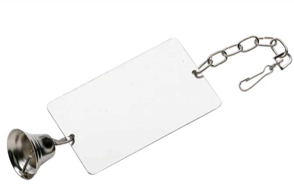 Et spejllegetøj til forfængelige fugle! Den er lavet af metal og har en klokke og en kæde med en krog til at fastgøre den til buret. Den fås i to modeller. Denne model er velegnet til undulater og kakaduer.