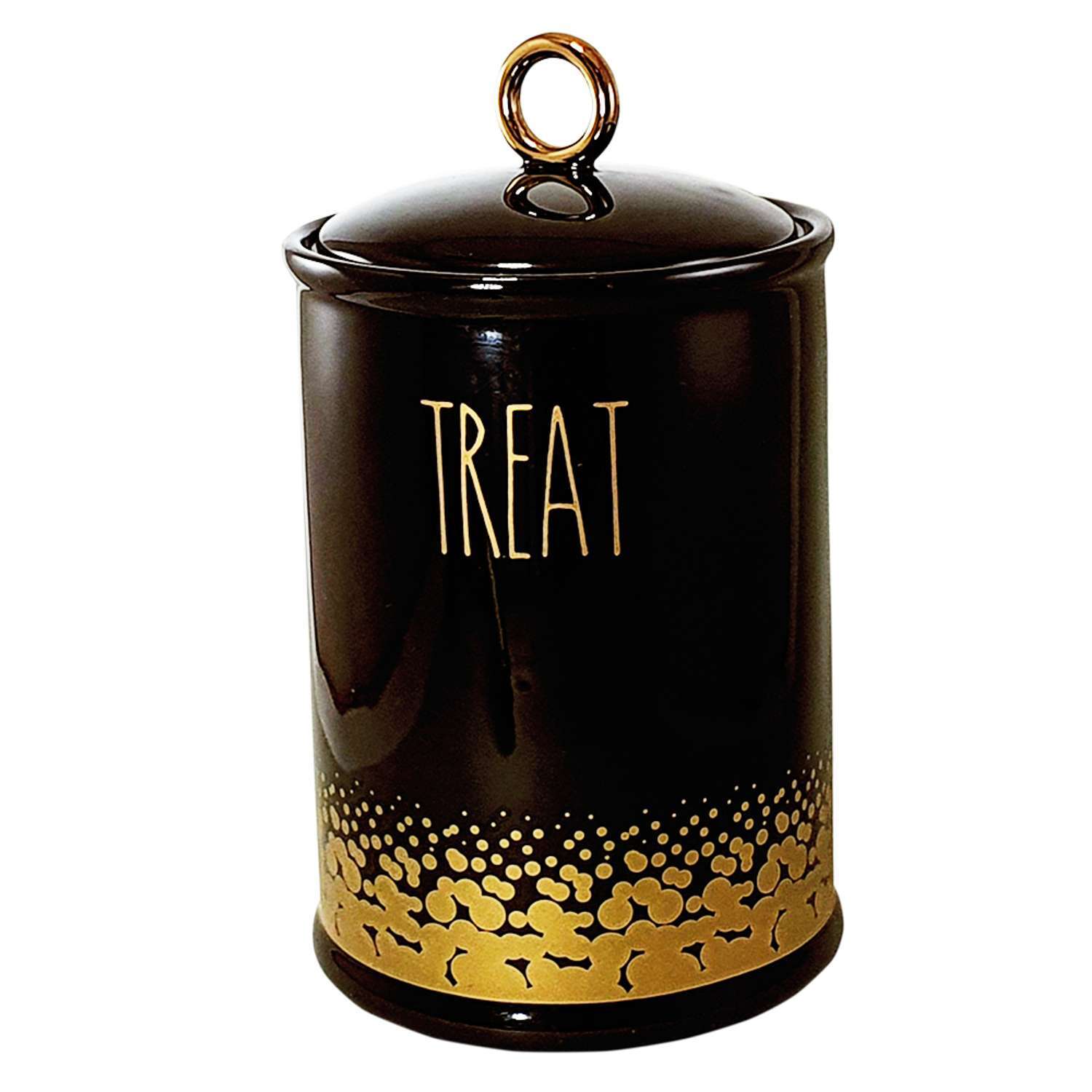 Keramisk snackbeholder “Treat” i guld-sort med silikone ring i låget, der holder indholdet frisk og aromatisk. Ikke egnet til opvaskemaskine eller mikrobølgeovn.