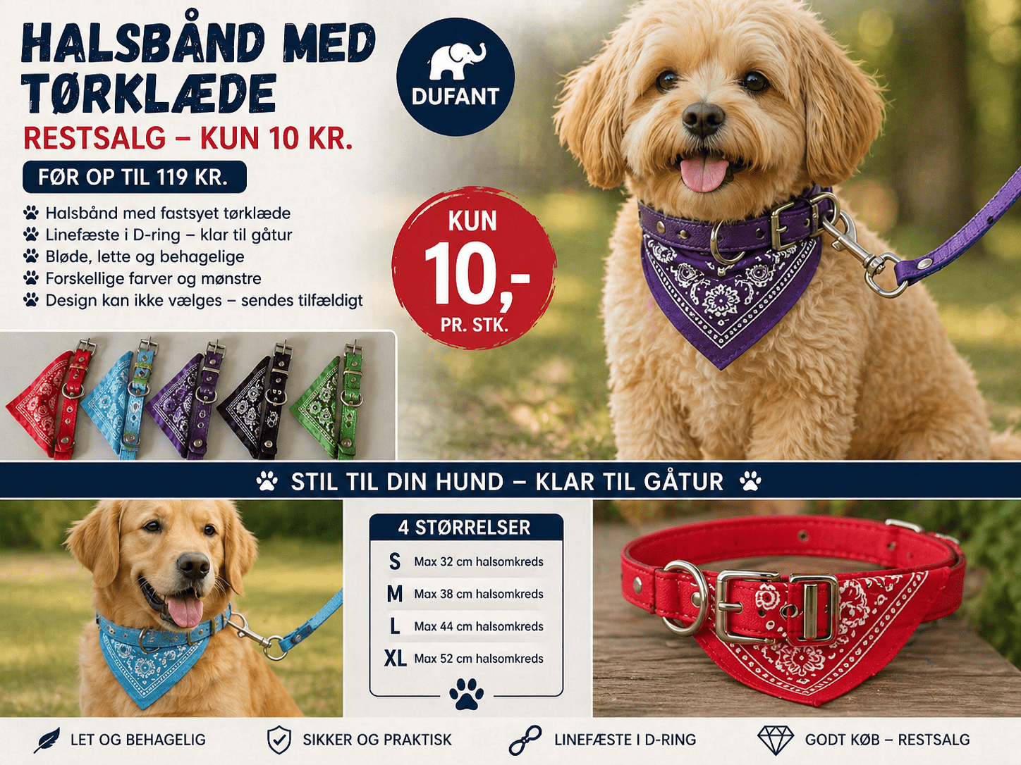 Gør din hund ekstra fin til en pris, der næsten ikke er til at tro. Disse halsbånd med fastsyet tørklæde kombinerer stil og funktionalitet – perfekt til både hverdag og gåture.
