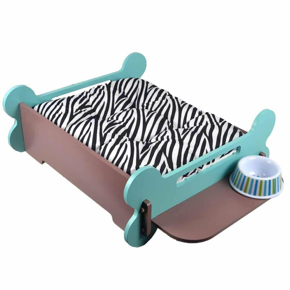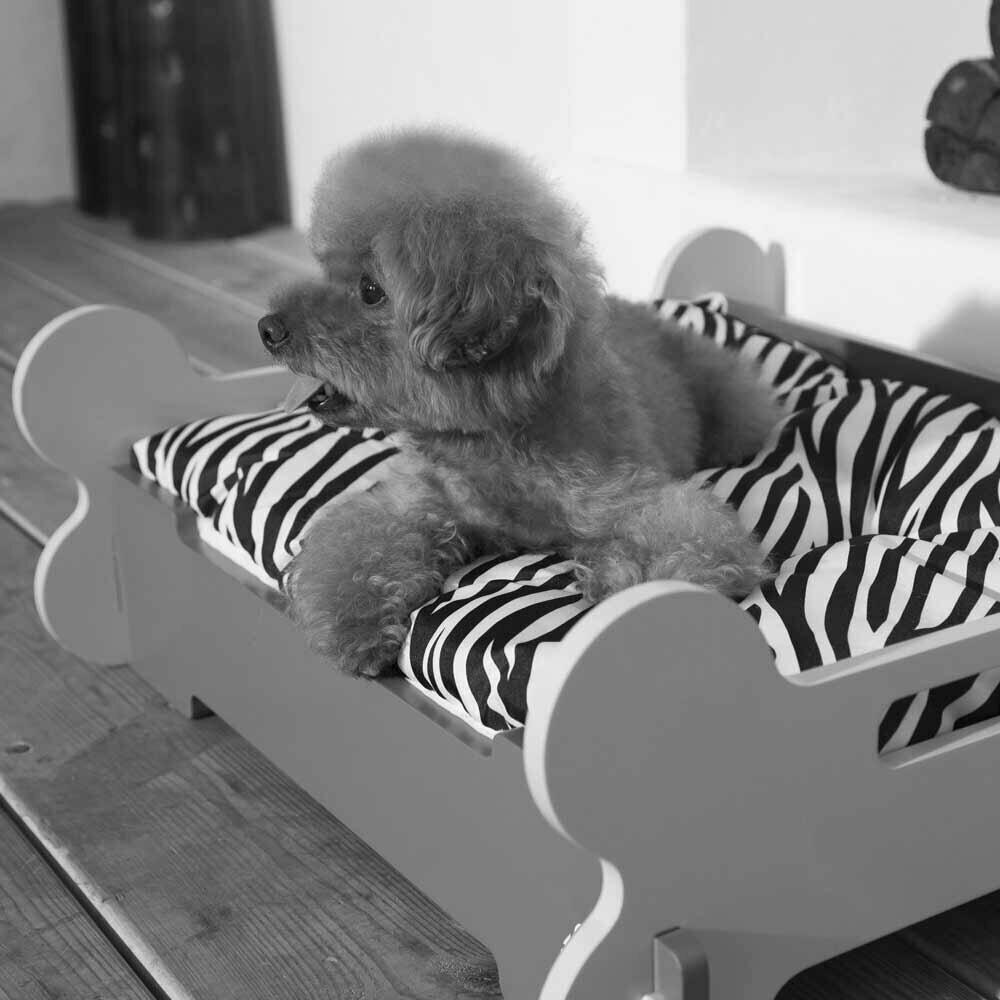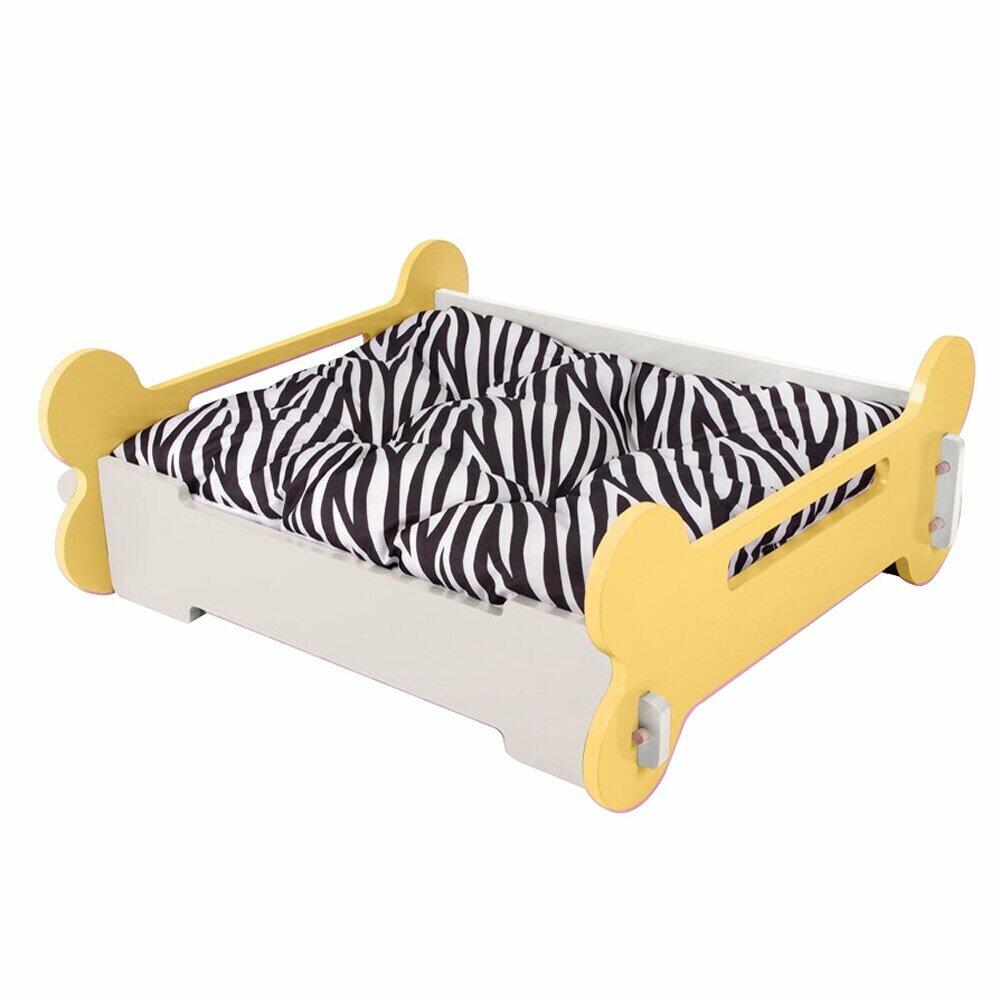 Denne hundeseng, er meget innovativ og lavet af ægte træ. Den bløde, vendbare pude giver dit kæledyr den nødvendige hyggekomfort. Træsengestellet samles hurtigt uden værktøj og giver denne brede hundeseng god stabilitet og beskytter dit kæledyr mod den kolde jord. Afhængigt af dit humør kan du forvandle din hunds pude til et zebra-look eller blot hvidt. Fodenden af denne hundeseng er forsynet med et opbevaringsrum, hvor hundelegetøj eller foderskålen kan finde sin plads.