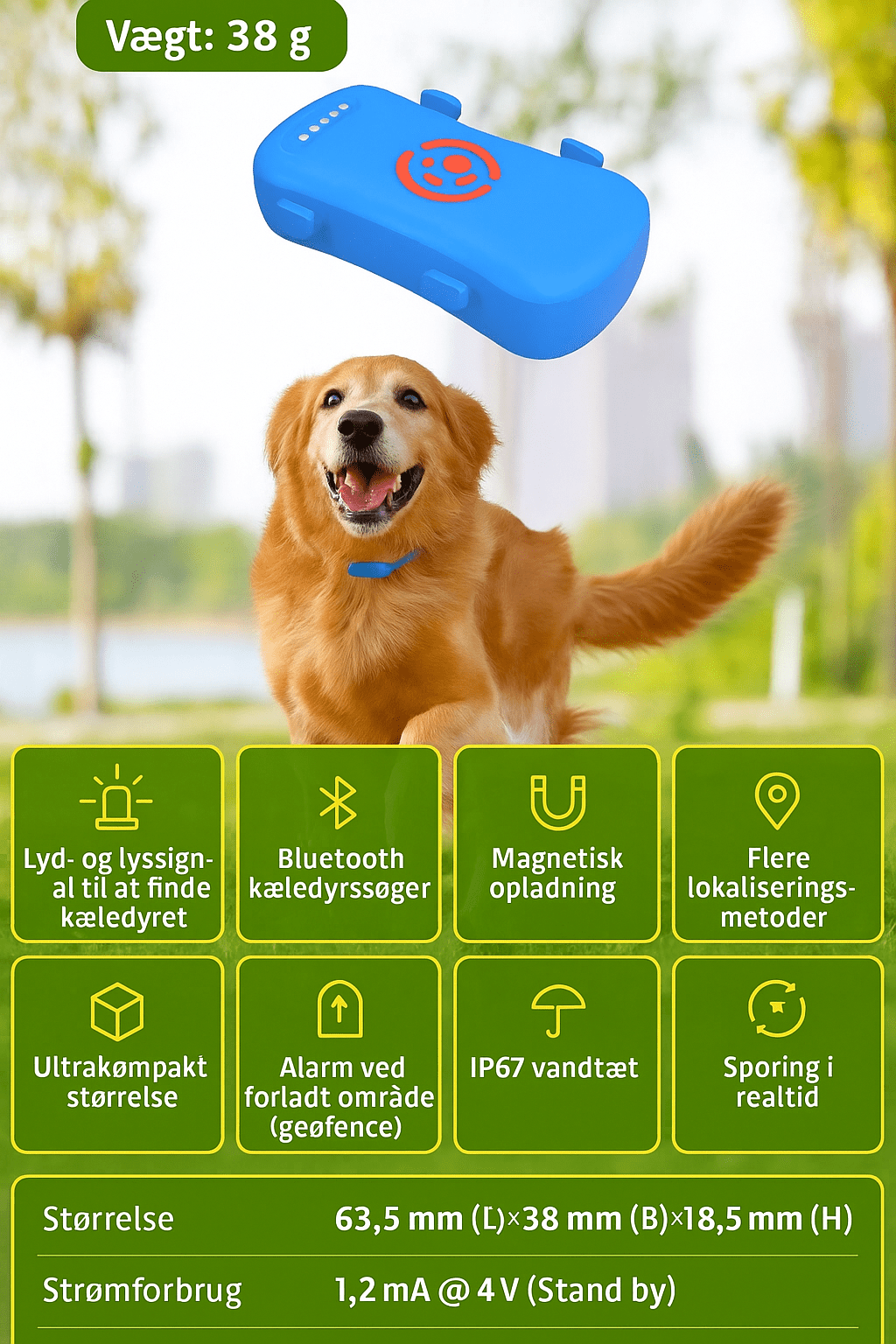 en kompakt og let gps-tracker til kæledyr med bluetooth-søgning og flere driftstilstande. enheden fungerer sammen med en app, som gør det nemt at holde overblik over dit kæledyrs daglige aktivitet. trackeren er designet til lavt strømforbrug, lang batteritid og har et vandtæt design, der gør den velegnet til mange forskellige situationer.