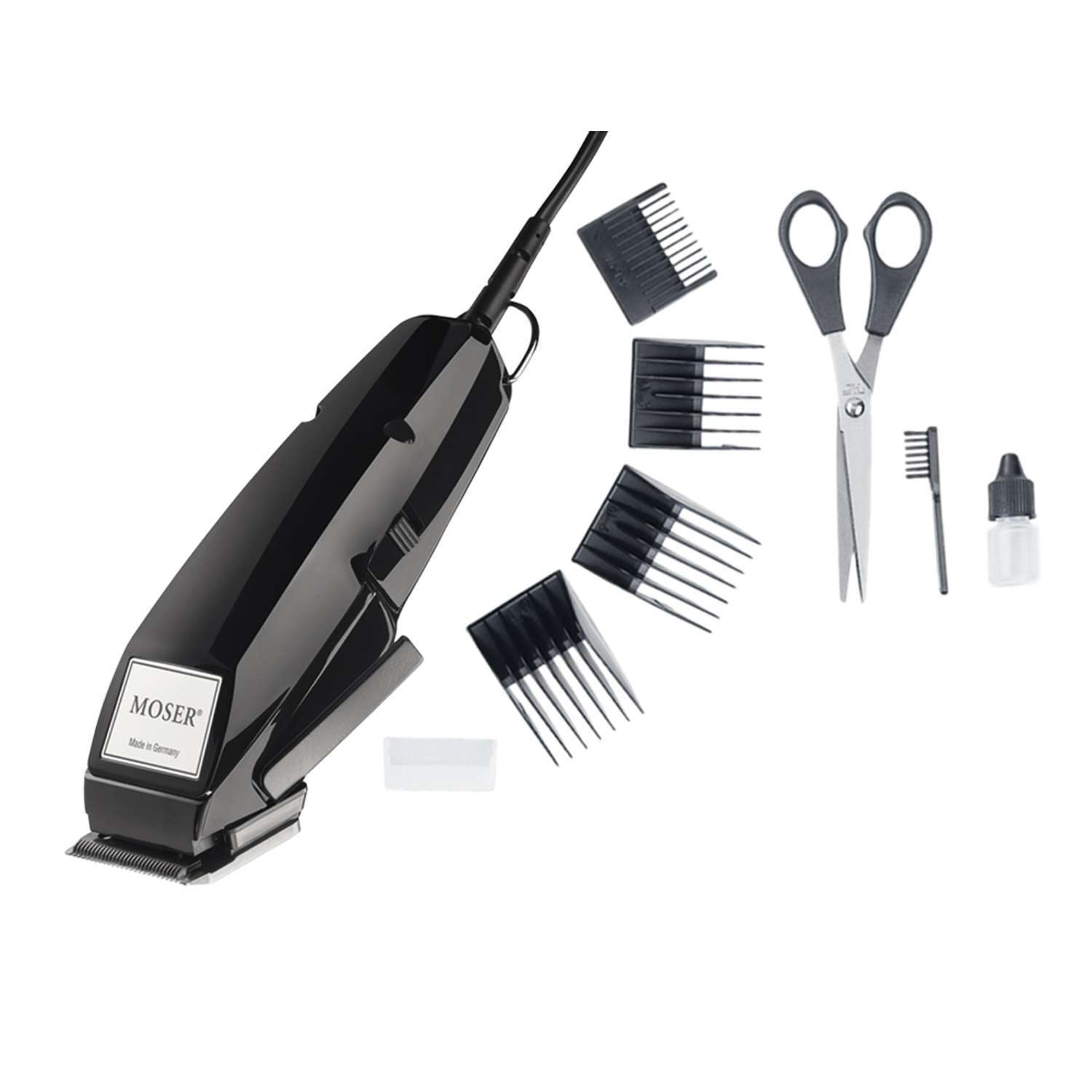 Moser 1400 hundetrimmer med vibrerende armatur, inklusiv klippe kamme, saks, olie, rengøringsbørste, klingebeskytter, strømforsyning og 10 watt effekt. Ideel til fuld klipning af små hunde. Justerbar skærelængde fra 0,1 til 3 mm med 6 fastlåsende positioner. Rustfrit stål skæresæt garanterer lang levetid.